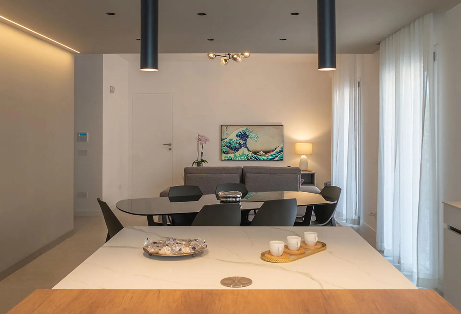 The fragmentation of the boundaries, both internal and external, gives rise to a series of recesses of varying depths and dimensions, designed to accommodate different functions and elements. In the living area, all doors are flush-fitting, ensuring a clean, uninterrupted aesthetic (for access to the storage cupboard behind the TV wall, the bathroom and the passageway to the sleeping area). The door separating the walk-in wardrobe from the master bedroom, however, is a flush-fitting sliding glass door, maintaining stylistic consistency.